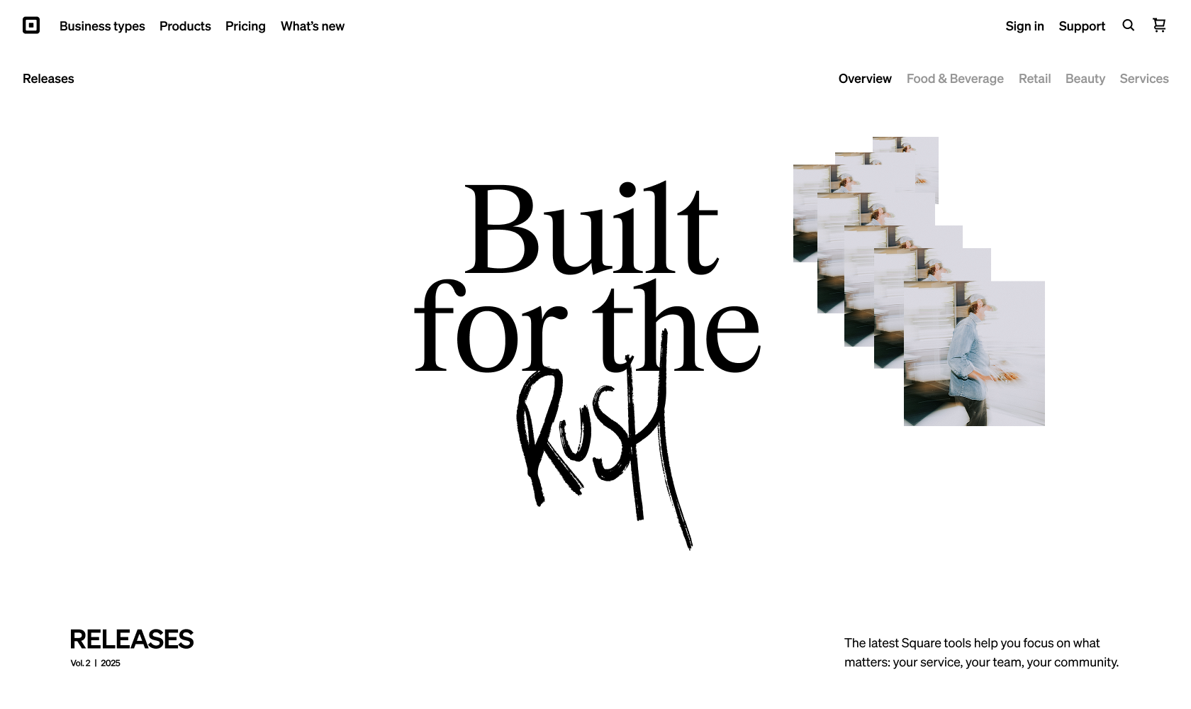Square is constantly innovating and launching new products and features across its entire ecosystem, but it lacked a centralized, consistent surface to learn about these new tools. Enter Square Releases: A bi-annual launch moment designed as a resource for sellers to learn about everything new, all in one place. I serve as the lead writer for public web, video, event, and print — and work cross-functionally with marketing on strategy and messaging.